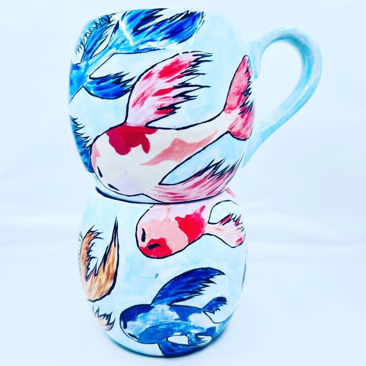 Don't be so "coy" and make this amazing over-sized mug…. Yours!! this beauty was hand painted by one of our greatest artists. It's a fishy and fun way to start your day with a morning drink!