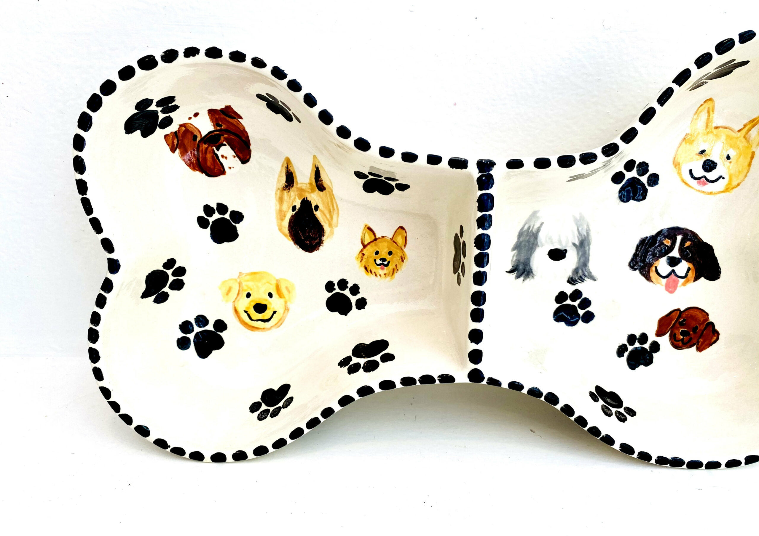 Need a need dog bowl for your furry friend? order one of these custom dog bone shaped bowl. Perfect size for most dogs! and we can also paint any dog you'd like to see on it!